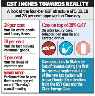 - The Goods and Services Tax – GST will be levied at multiple rates ranging from 0 per cent to 28 per cent. Ultra luxuries, demerit and sin goods, will attract a cess for a period of five years on top of the 28 per cent GST. Overcoming opposition from some States, the GST Council finalised a multiple-slab rate structure, including the cess, for the new indirect tax. The quantum of cess on each of these will depend on the current incidence of tax.