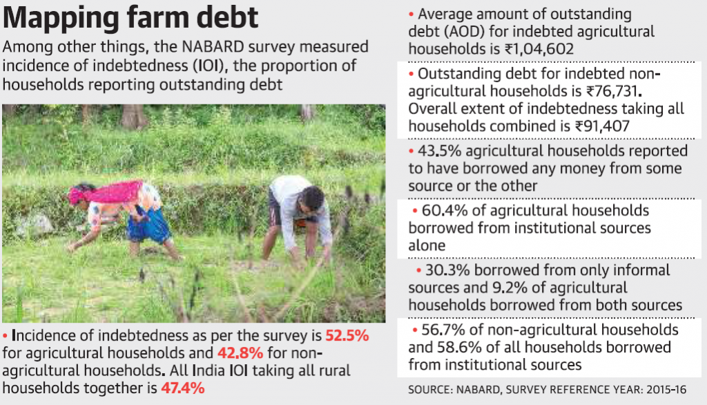 - More than half the agricultural households in the country have outstanding debt, and their average outstanding debt is almost as high as the average annual income of all agricultural households, according to a recent survey by the National Bank for Agriculture and Rural Development (NABARD).