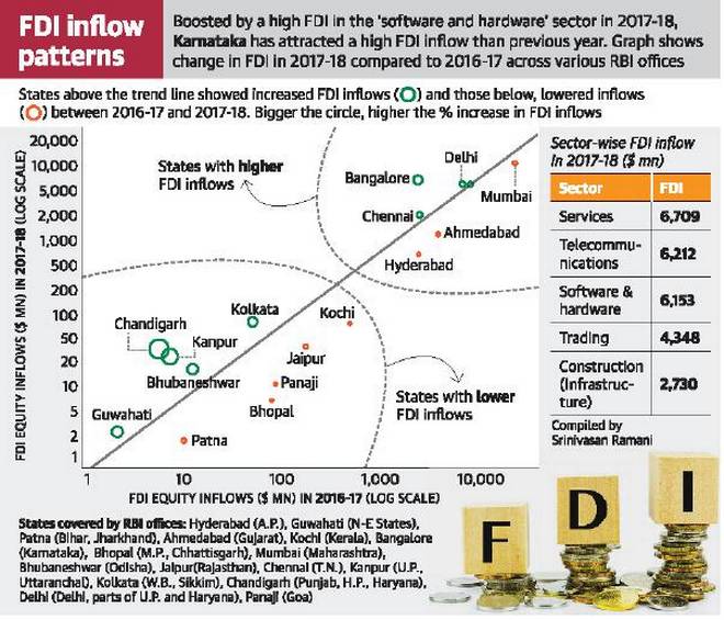 - Karnataka registered the biggest increase in Foreign Direct Investment (FDI) last year, as inflows from overseas jumped 300% in the 12 months ended March 2018.