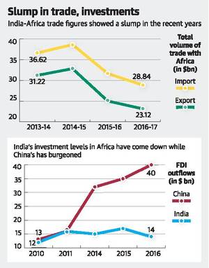- A similar slump both in actual and comparative terms has been seen in India-Africa trade figures from 2013 to 2017, when export and import figures fell from $67.84 billion to $51.96 billion.