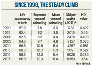 - According to the 2018 findings, between 1990 and 2017, India’s HDI value increased from 0.427 to 0.640, an almost 50 per cent increase, which is an indicator that millions have been lifted out of poverty.