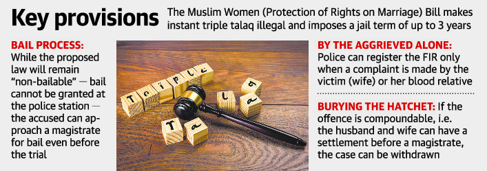 - The offence of instant triple talaq has also been compoundable with a provision that allows the wife to withdraw a complaint or approach the magistrate for a dispute settlement.