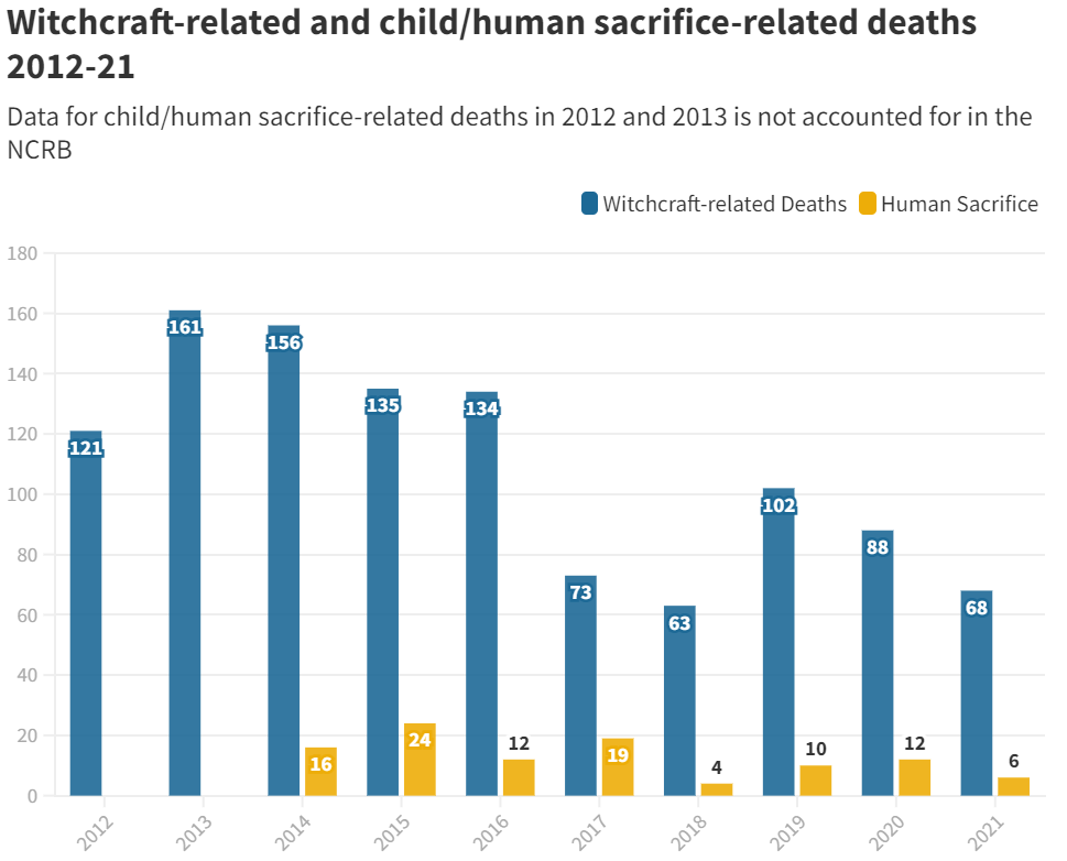 - राष्ट्रीय अपराध रिकॉर्ड ब्यूरो (National Crime Records Bureau (NCRB)) की वर्ष 2021 की एक रिपोर्ट के अनुसार छह मौतों को मानव बलि से जोड़ा गया था, जबकि 68 हत्याओं का मकसद सीधे तौर पर जादू टोना से जुड़ा हुआ था।